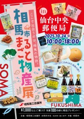 | 相馬市まるごと物産展 in仙台中央郵便局 開催! ![]() 仙台中央郵便局内のイベントスペースにおいて、相馬市の物産販売を行います。 1,000円以上購入された方、先着100名に粗品をプレゼント! 2025/10/24(金) 10:00~18:00 宮城県仙台市・仙台中央郵便局内 イベントスペース